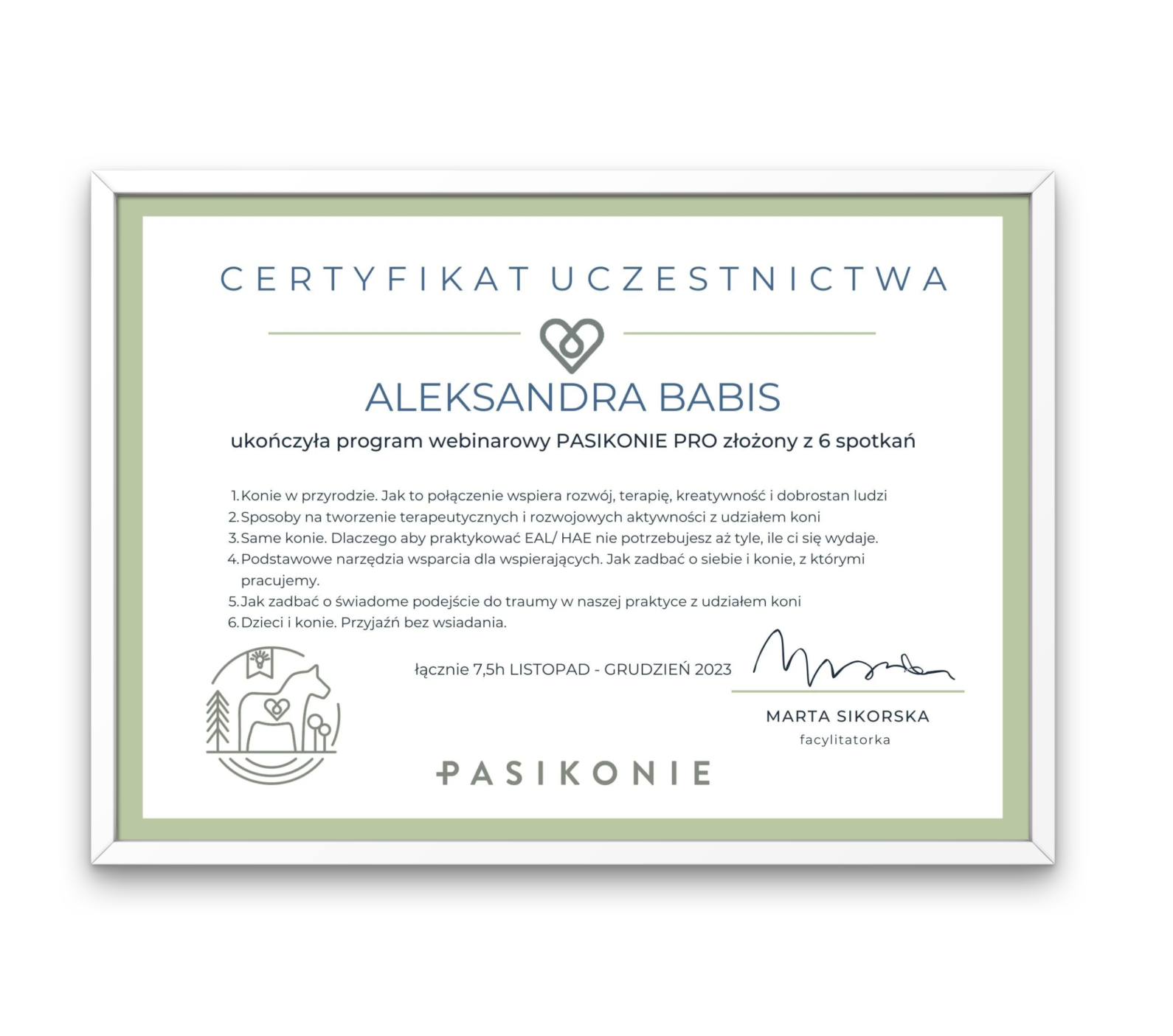 CERTYFIKAT (POTWIERDZENIE) Po zrealizowaniu ścieżki edukacyjnej otrzymasz imienny certyfikat, który potwierdza Twoje zaangażowanie w rozwój kompetencji i znajomość standardów pracy Pasikonie PRO.